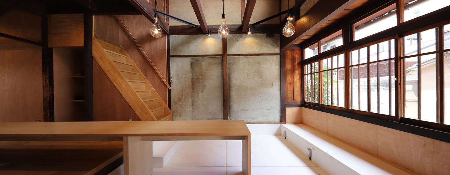 京都、壬生にある築90年の京町家のリノベーションプロジェクトです。かつて染物職人の住居として利用されていた京町家を新しい居住者であるインターネット物販を行う企業の方のオフィス兼住居とするものです。柱梁等の構造体は全てもとのまま保存し、また既存の土壁等も補修を加えながらそのまま利用しました。その上で、新しい生活に必要な機能を新しい素材、作り方で配置していきました。結果として、古いモノと新しいモノが隣接し、一つの建築の中に色々な時代のものが折り重なった空間が現れました。